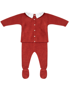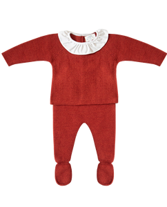 Our Pierrot two-piece outfit set features a delicate vertical pointelle pattern and is finished with fine ribbing at the cuffs and hem. Coordinating footed leggings are rendered in a smooth stockinette weave for a seamless, comfortable fit. With a playful Pierrot collar in textured cotton, our range comes in a series of rich, jaunty colours from dusty rose to burnt sienna.