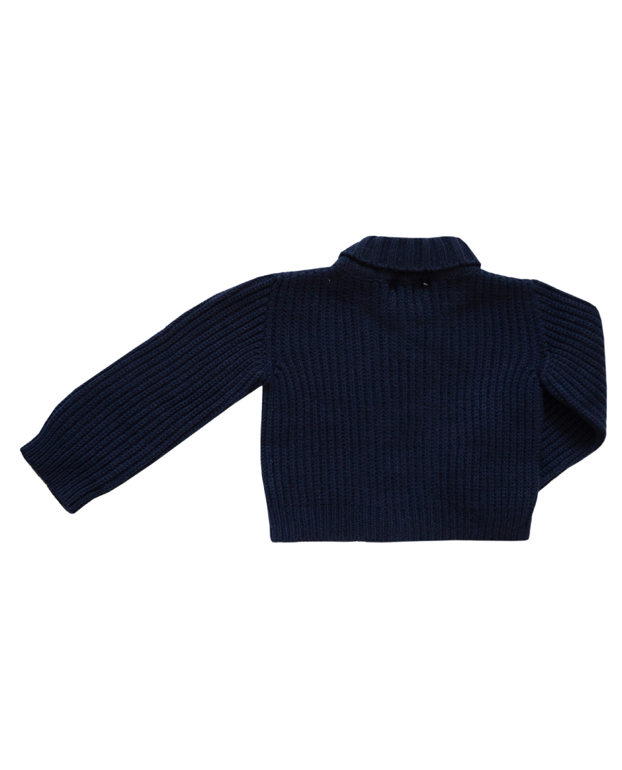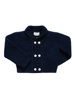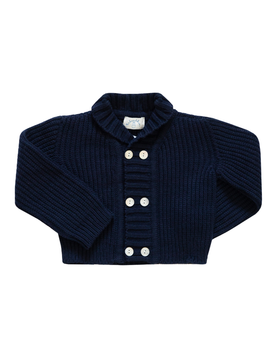 Knitted in a soft merino blend, our boy's double-breasted cardigan is defined by its structured rib weave and clean silhouette. The shawl collar and contrast buttons lend a subtle sense of formality, while maintaining an easy, comfortable fit.