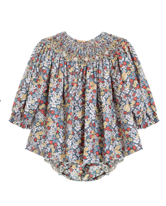The Coppelia baby dress is crafted from a warm, winter cotton in a vibrant chamomile floral. Bishop smocked by hand and embellished with a little hand-embroidered white flowers, the Coppelia baby dress features a voluminous sleeve and comes with matching lace-trimmed bloomers to cover nappies and to offer an outfit set after growth spurts.