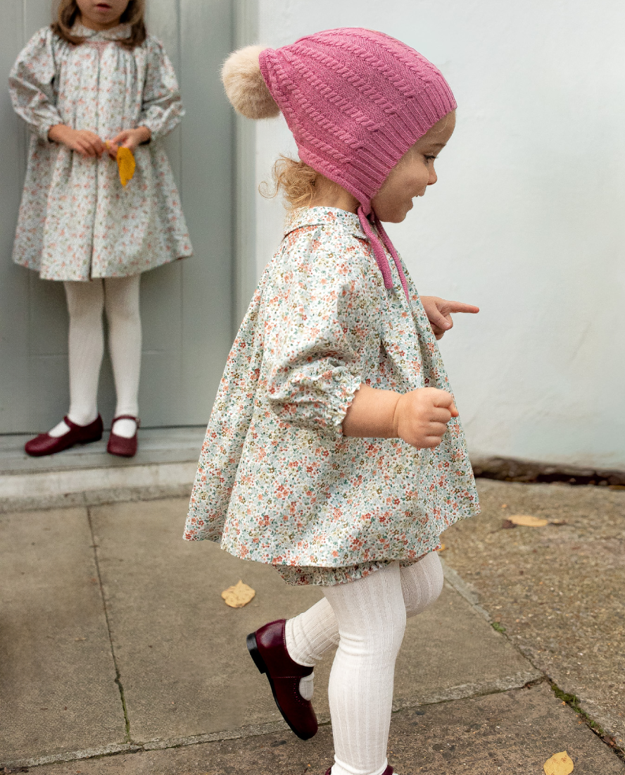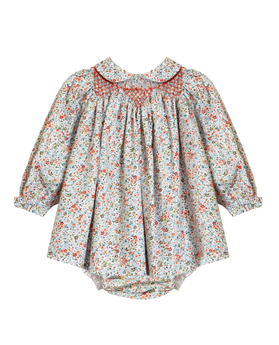 The Giselle baby dress is crafted from a warm, winter cotton in an autumnal ditsy floral. Bishop smocked by hand and embellished with a delicate geometric pattern in vibrant sienna, the Giselle baby dress features a peter pan collar and comes with matching lace-trimmed bloomers to cover nappies and to offer an outfit set after growth spurts.