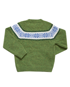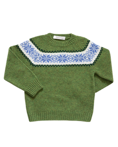 Introducing our new merino wool fairisle jumpers for children, knitted for us by hand in Italy. Crafted from a tonal moss green spun with notes of sage and olive, our soft, cosy round-neck sweaters feature traditional Fair Isle reimagined in refined, modern colourways.