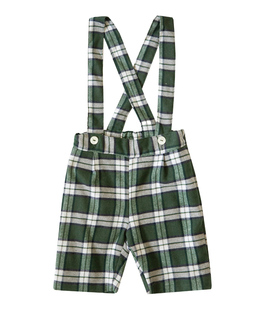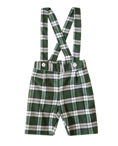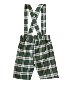 These tailored suspender shorts are cut from forest-green tartan for a cohesive, heritage-inspired look. The structured silhouette is balanced by an elasticated waistband for ease of movement, while the cross-back straps keep the fit secure and clean. Finished with precise pattern matching and a soft interior lining, the design offers a polished, traditional style that pairs effortlessly with knitwear or shirting.