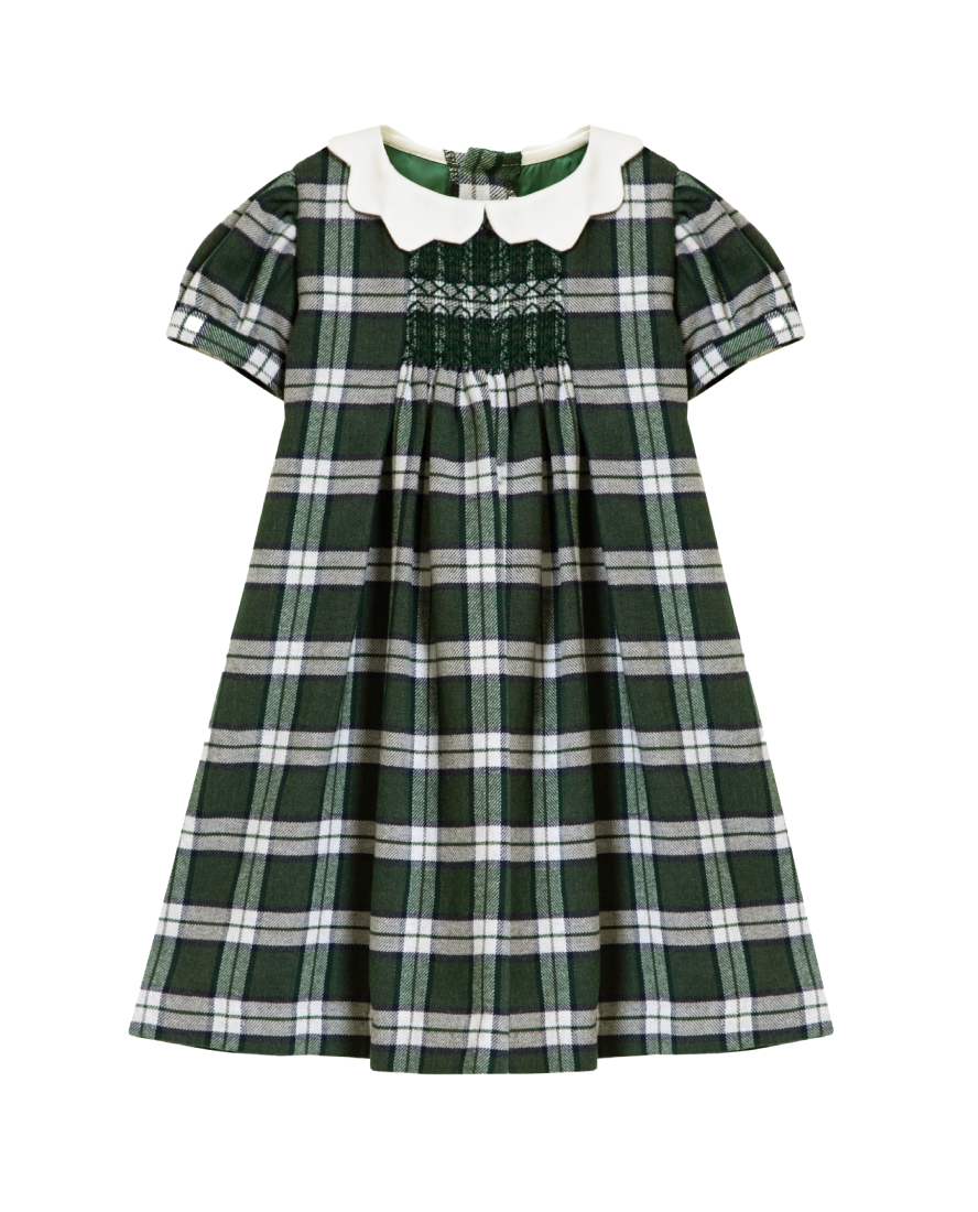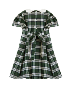 A timeless dress crafted in a deep forest-green tartan, designed with crisp structure and refined detailing. The piece features hand-stitched smocking across the bodice, adding subtle texture while maintaining a classic silhouette. A contrast white collar brings sharp definition to the neckline, complementing the tailored puff sleeves and buttoned cuffs. Fully lined for comfort and shape, this dress delivers an elevated, heritage look suitable for both everyday polish and formal occasions.