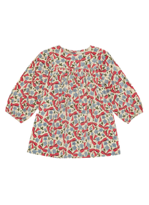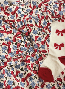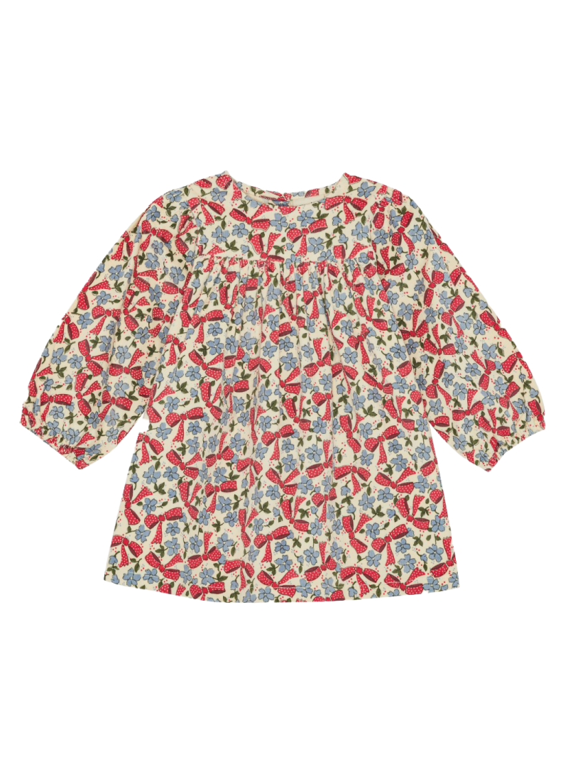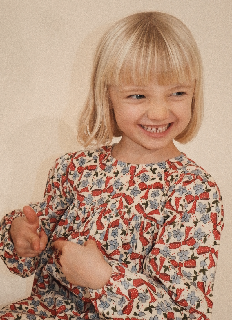 The Amber Dress is cut on the yoke with long sleeves. Crafted from needle corduroy, scattered with red ribbons and blue flowers, the playful print brings a nostalgic charm to this wearable dress. An easy favourite for everyday wear or festive occasions alike.