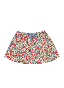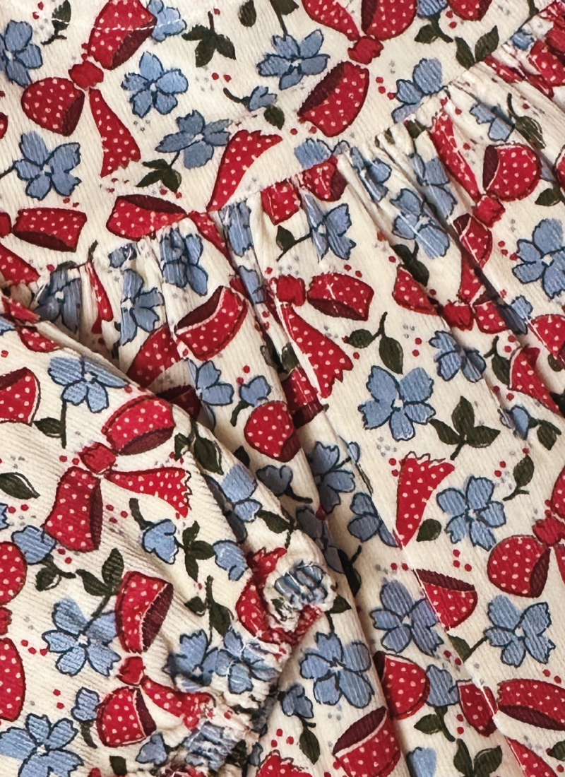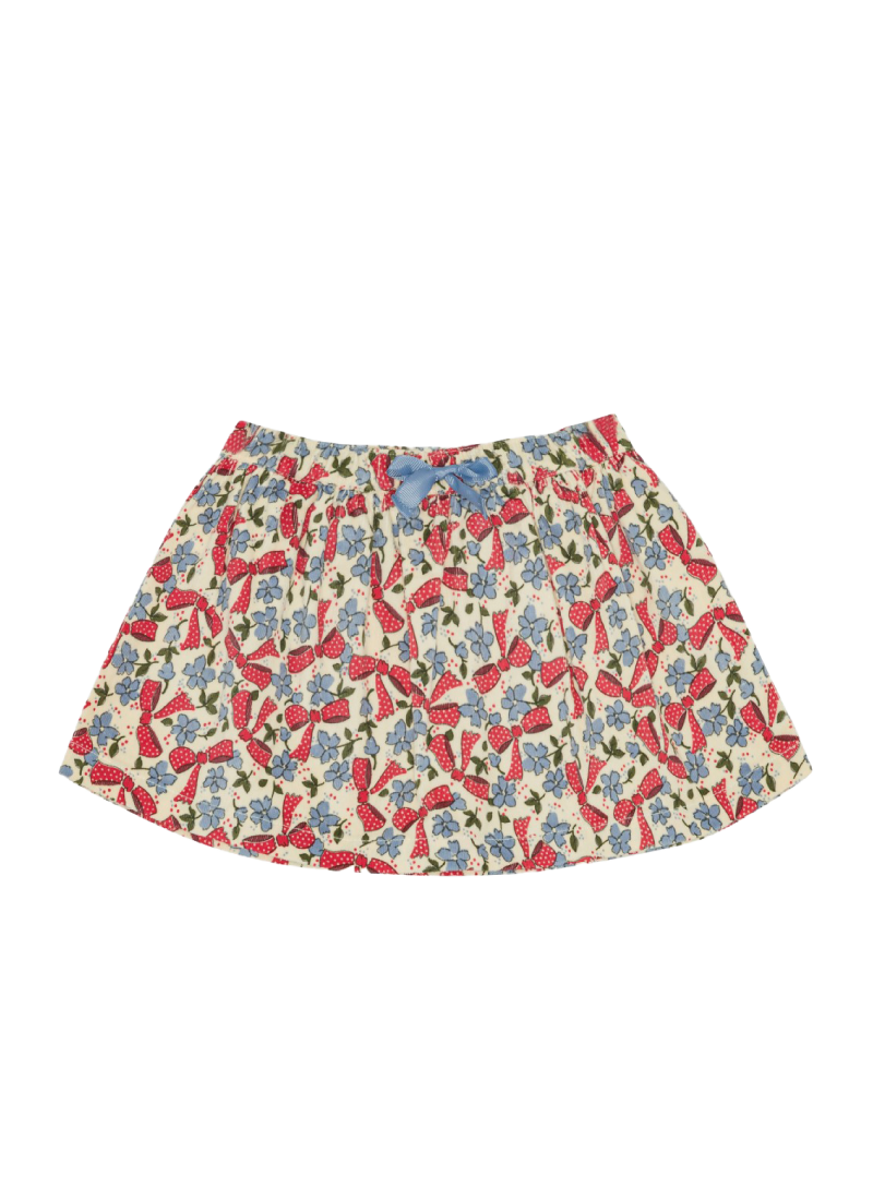 The Amber Skirt is a seasonal staple from Danish brand Flöss. Crafted from needle corduroy, scattered with red ribbons and blue flowers, the playful print brings a nostalgic charm to this cosy, comfortable, wearable piece. Finished with a baby blue ribbon tie at the front, it’s a lovely choice for everyday wear or festive occasions alike.