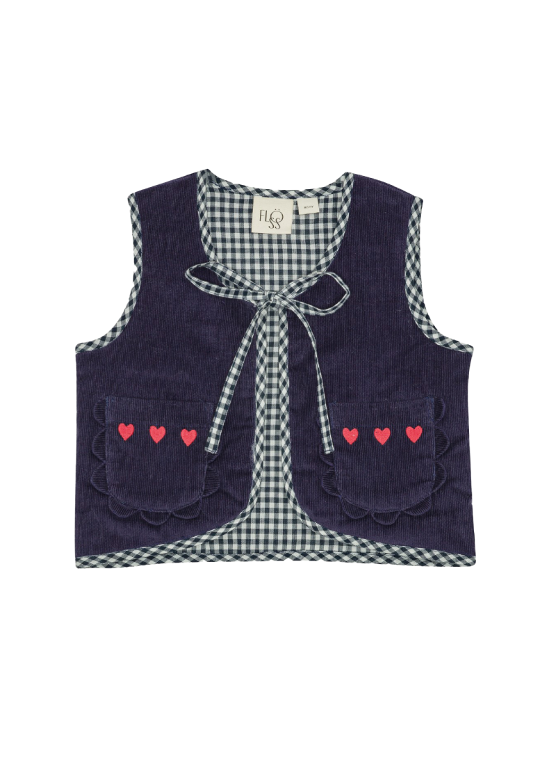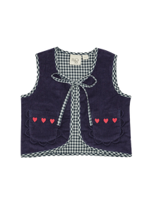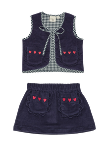 The Billie Girls Jacket in navy corduroy, a playful yet practical piece from Flöss. It features sweet front pockets embroidered with red hearts, a soft gingham lining, and a delicate ribbon tie at the front. A charming layer for the fall/winter season, designed to be styled with the matching Billie skirt for a smart set, adding texture and a touch of whimsy to everyday outfits.