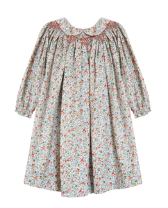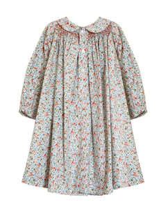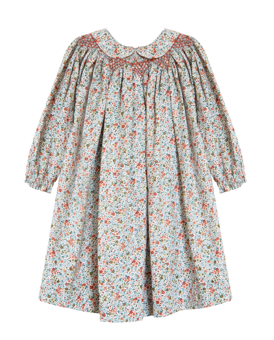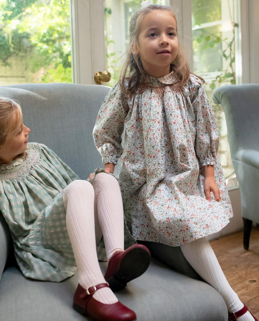 The Giselle dress is crafted from a warm, winter cotton in an autumnal ditsy floral. Bishop smocked by hand and embellished with a delicate geometric pattern in vibrant sienna, the Giselle dress features a peter pan collar and comes with matching lace-trimmed bloomers to cover nappies and to offer an outfit set after growth spurts.