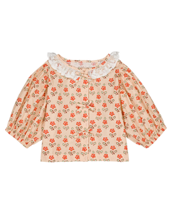 The Pia Sablet blouse by Hello Simone is crafted from soft cotton in a warm apricot floral print, scattered with small red blossoms for a cheerful yet timeless feel. The gently gathered silhouette is finished with three delicate front ties, adding subtle structure while keeping the look relaxed.