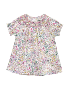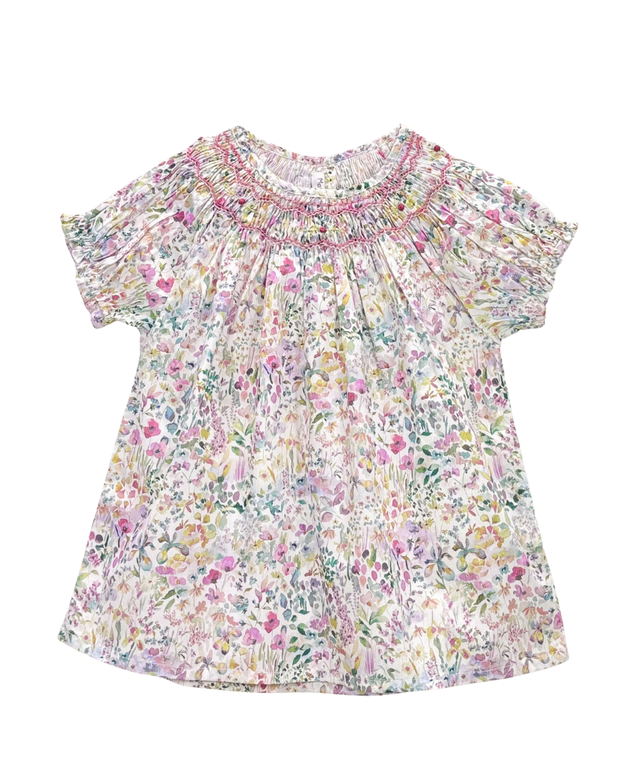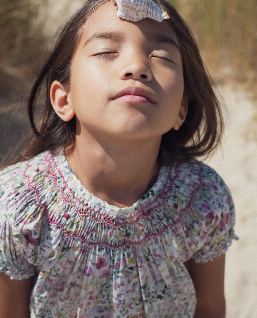 The Meryl girl's blouse is crafted from lightweight floral cotton in a softly painterly palette of blush, sage and butter tones. The gently puffed sleeves and ruffled collar add old-fashioned charm, with playful roses embroidered at the hand-smocked yoke.