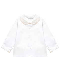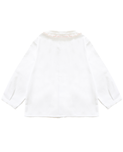 Our long-sleeve white girl's shirts are crafted from soft Italian cotton and feature a delicate frill colour with embroidered trims. Adding a sweet, feminine touch to a classic silhouette, they button up the front and at the sleeve cuff. Perfect for layering under knitwear or pairing with skirts and trousers, a versatile piece for the fall and winter season.