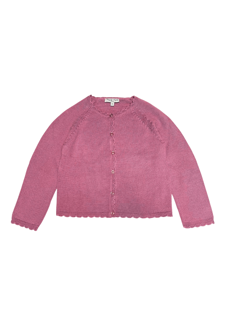 The Luna cardigan by Marie Puce is crafted from soft merino wool, in a deep rose pink for this autumn/winter season. Featuring raglan long sleeves and scalloped trims, it closes at the front with buttons for a relaxed fit perfect for layering. The girl’s cardigan can be coordinated with the matching bany Luna cardigan in smaller sizes and makes a lovely gift.