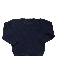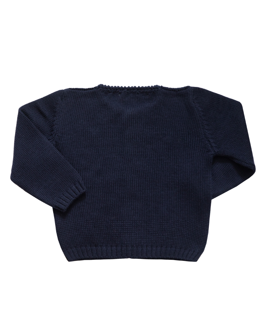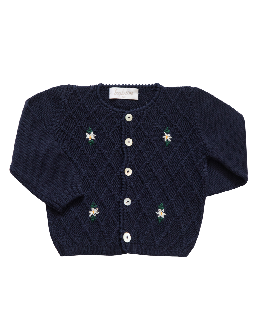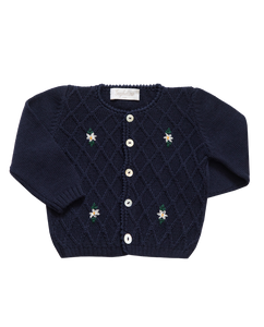 This Tirolese cardigan is hand-knitted in Italy from the finest merino wool in smart navy blue. A diamond trellis stitch adds gentle structure, while delicate, hand-embroidered edelweiss sprigs bloom across the front. Finished with a neat crew neckline, ribbed trims and ivory-toned buttons, it’s soft, cosy and exquisitely refined—an heirloom layer for babies and children.