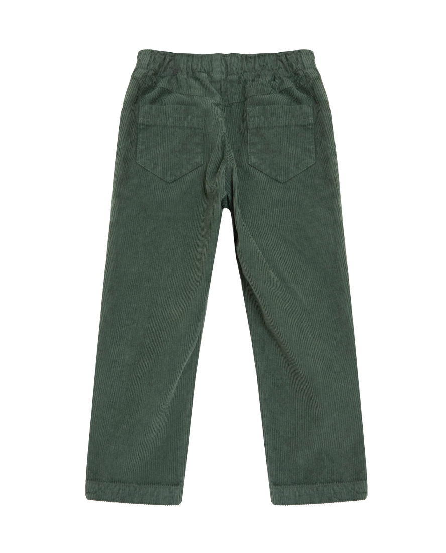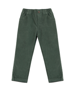 Classic boy's trousers crafted from a comfortable, robust corduroy in olive green, featuring an elastic waist band for a comfortable fit and a decorative chunky double button.