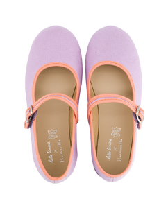 These summer Mary Jane shoes come from the much-anticipated collaboration between Hello Simone and Hermosilla Paris, combining playful colour with a classic silhouette. Crafted from durable cotton canvas in a soft lavender, they are finished with contrasting tangerine trim for a fresh, summery feel.