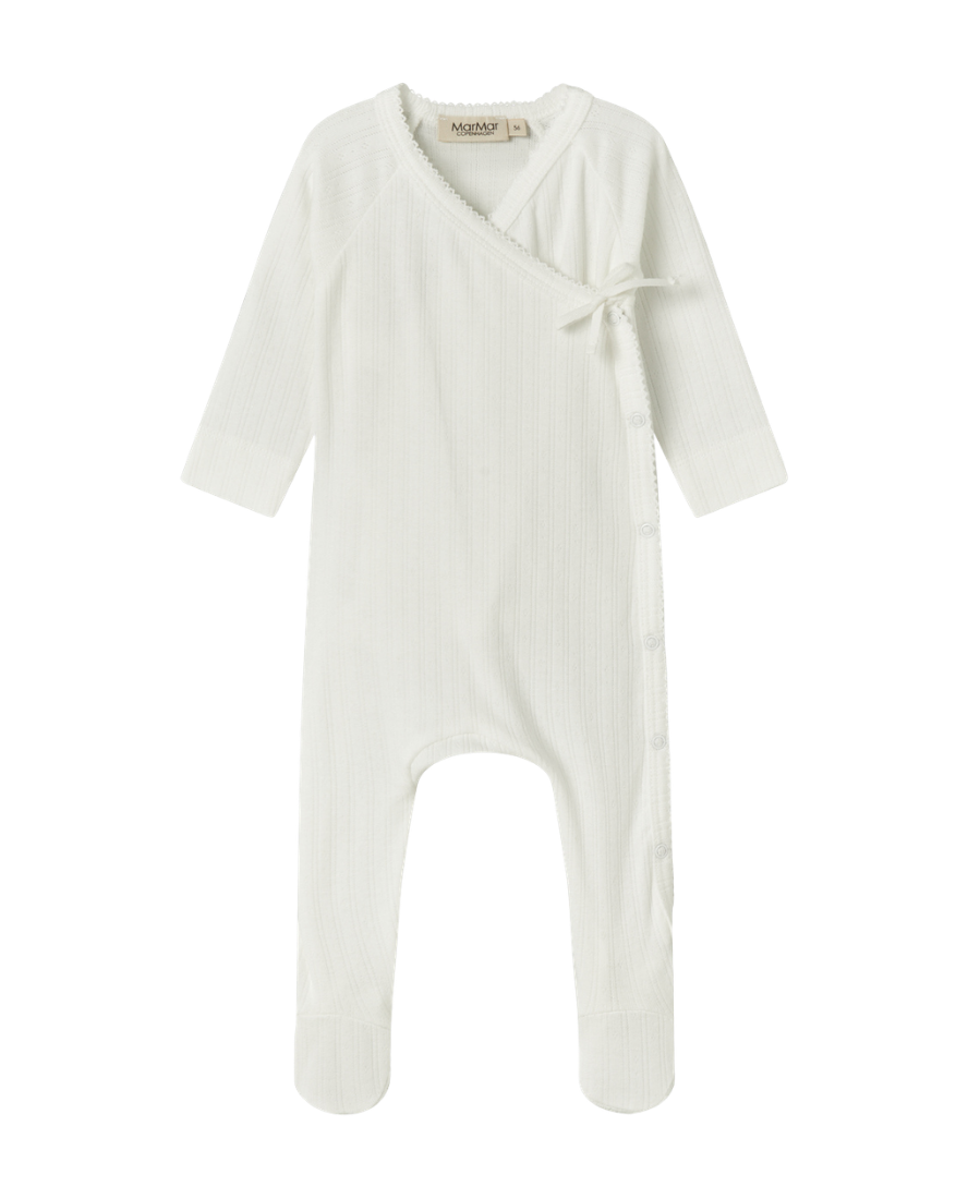 Soft and timeless this MarMar Copenhagen babygrow onesie fastens across the body and is crafted from a super soft cotton modal, in delicate pointelle. It features delicate side ties, snap closures and built-in footies for extra cosiness. A classic, comfortable essential for your baby.