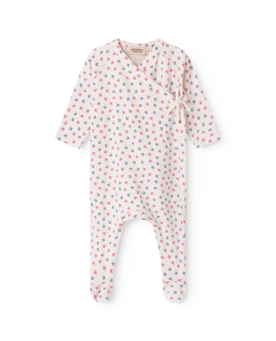Soft and timeless this MarMar Copenhagen babygrow onesie fastens across the body and is crafted from a super soft cotton modal, scattered with pretty little flowers. It features delicate side ties, snap closures and built-in footies for extra cosiness. A classic, comfortable essential for your baby.
