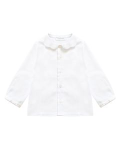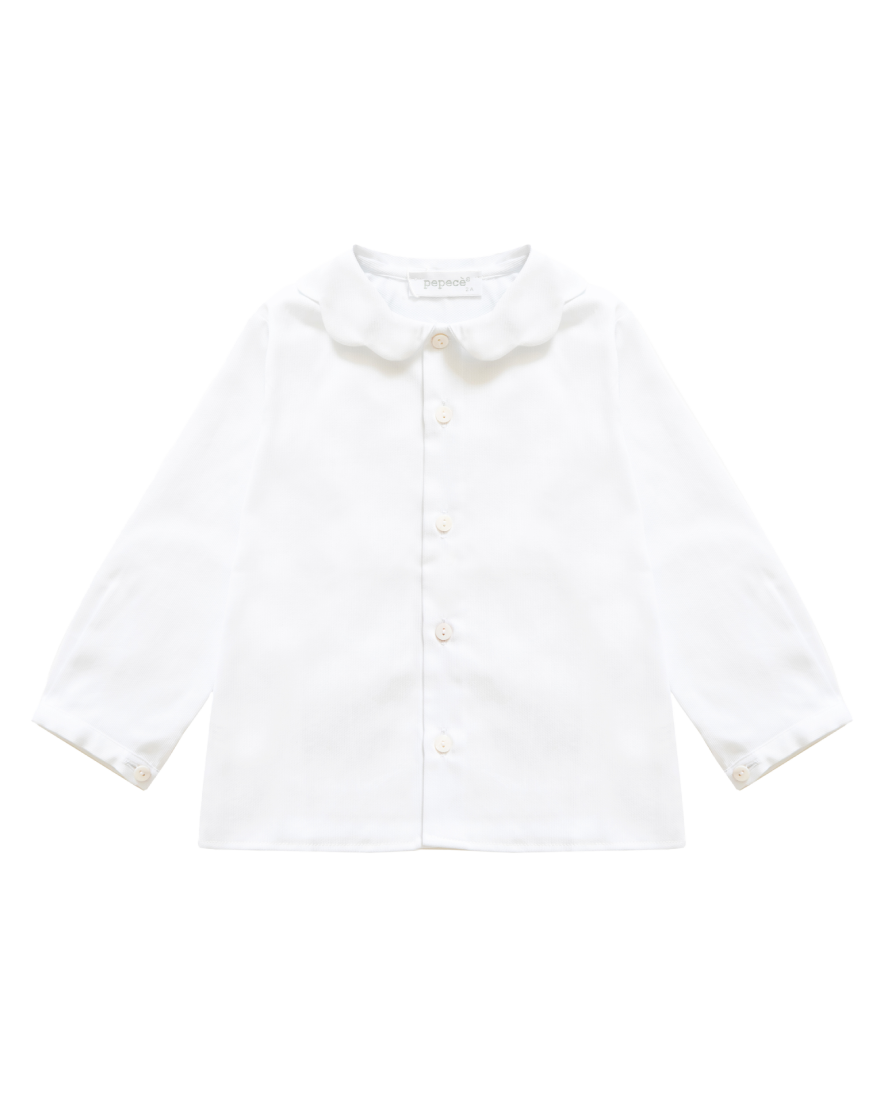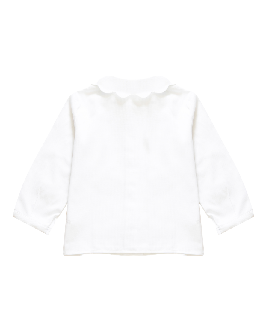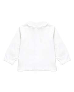 This beautifully crafted white shirt is made in Italy from warm, winter Italian cotton. Featuring a delicate scallop collar, it adds a touch of timeless elegance to any outfit. Ideal for layering under dresses, cardigans, or knits, this shirt is a versatile wardrobe essential for the fall/winter collection.