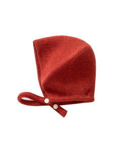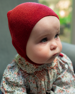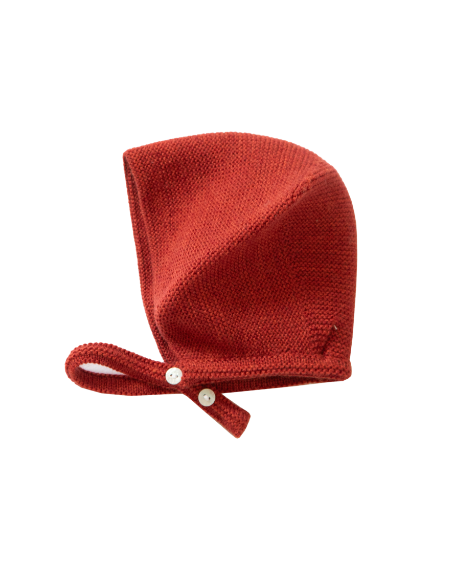 Crafted from a soft merino blend, our baby bonnets are defined by a seamless garter stitch weave, creating a supple texture with an ergonomic shape for a close, gentle fit. A delicate buttoned strap secures neatly beneath the chin. Rendered in a range of rich, jaunty colours from dusty rose to burnt sienna.
