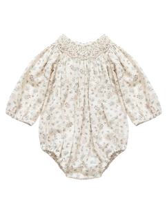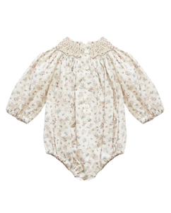The Manon newborn romper is crafted from a beautiful cream cotton swiss dot, printed with delicate florals in pale rose and gentle blues. Bishop smocked by hand and embellished with hand-embroidered flowers, the Manon is designed with going home outfits and very first occasions in mind. The romper fastens at the back and crotch with mother of pearl buttons, and should be layered over a white cotton body in cooler months.