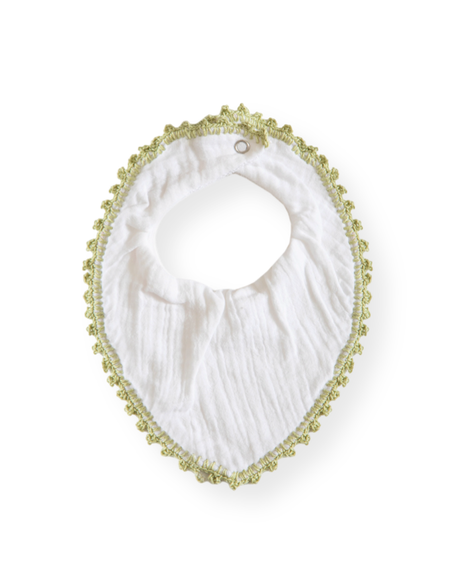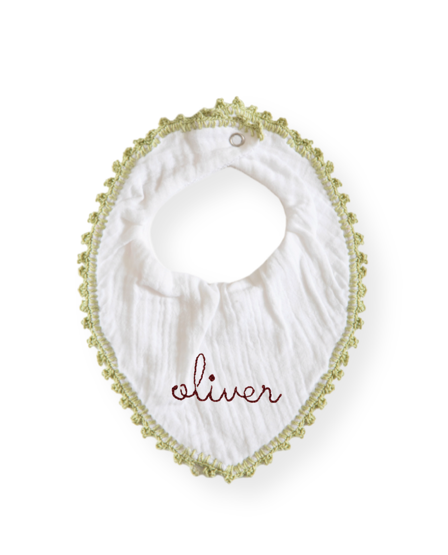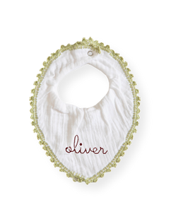 Little muslin baby dribble bibs that fasten at the neck with a popper and feature fun, colourful, crochet trims. Crafted from the finest cotton this bib can be personalised with a name or initials..