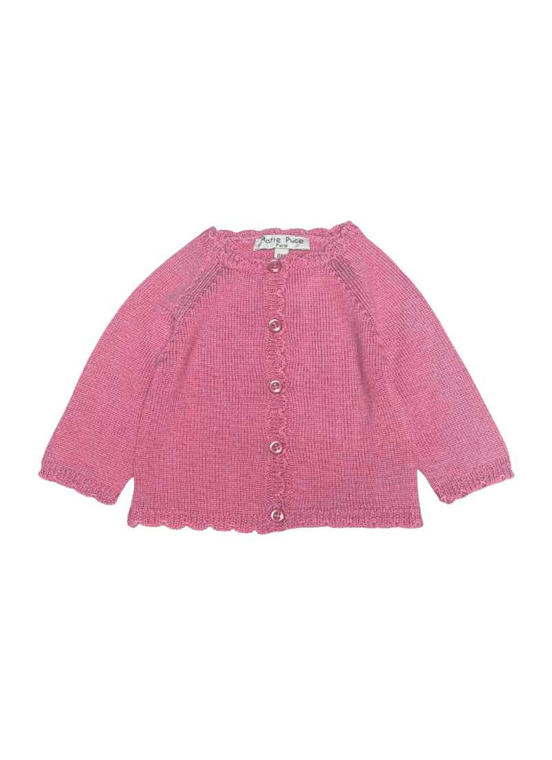 The Luna baby cardigan by Marie Puce is crafted from soft merino wool, in a deep rose pink for this autumn/winter season. Featuring raglan long sleeves and scalloped trims, it closes at the front with buttons for a relaxed fit perfect for layering. The baby cardigan can be coordinated with the matching girls Luna cardigan in bigger sizes and makes a lovely gift.