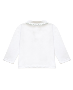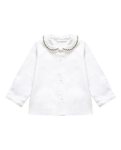 Our long-sleeve white girl's shirts are crafted from soft Italian cotton and feature a delicate frill colour with embroidered trims. Adding a sweet, feminine touch to a classic silhouette, they button up the front and at the sleeve cuff. Perfect for layering under knitwear or pairing with skirts and trousers, a versatile piece for the fall and winter season.
