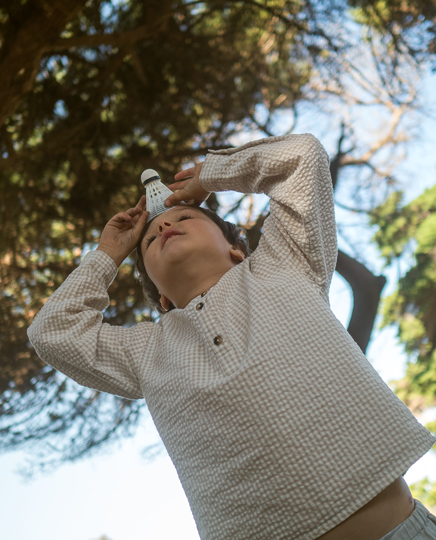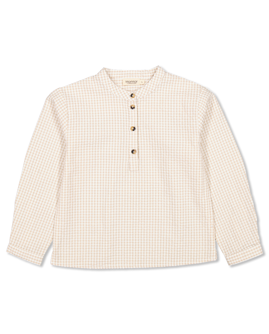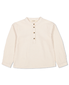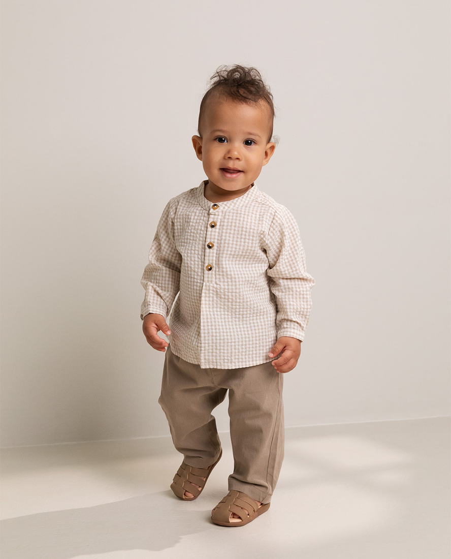 Classic neutral gingham baby shirt with a relaxed mao collar and short button placket, cut on the yoke - our favourite silhouette for little boys. The soft beige gingham can be worn everyday or styled with white for occasions...