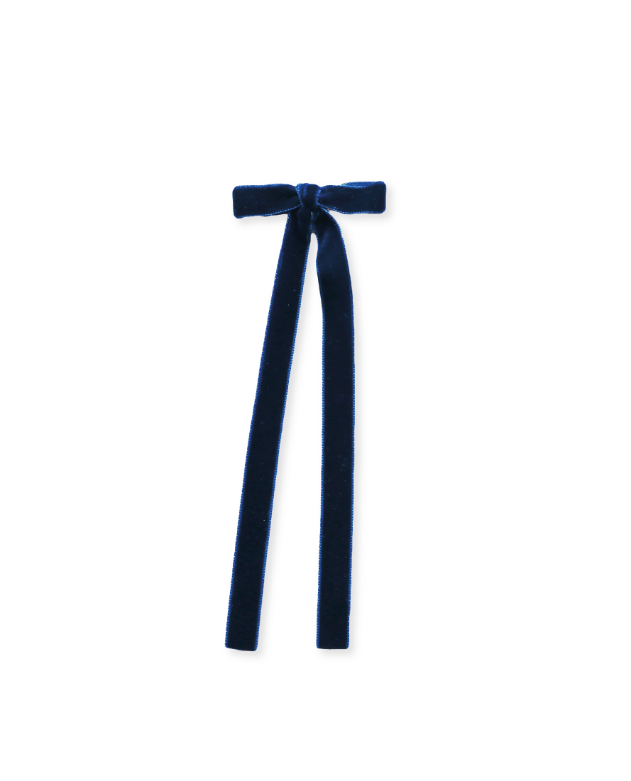 Hand-tied velvet long bow for girls' winter outfits and Christmas dresses. 9cm wide and 16cm long, stitched to a nickel-free snap clip.