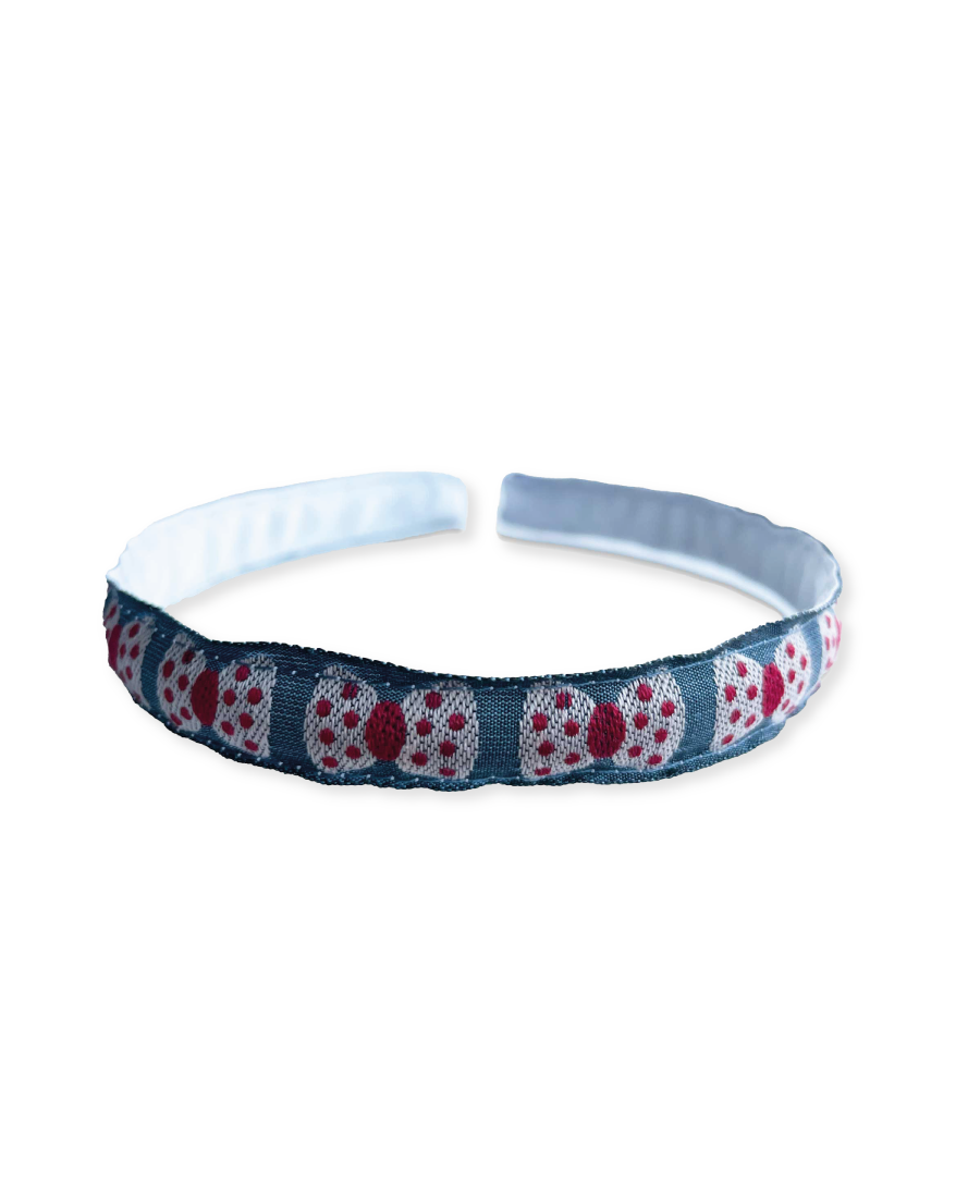 Woven cotton girl's headband, featuring a festive blue bow motif. Perfect for little Christmas gifts and stockings!