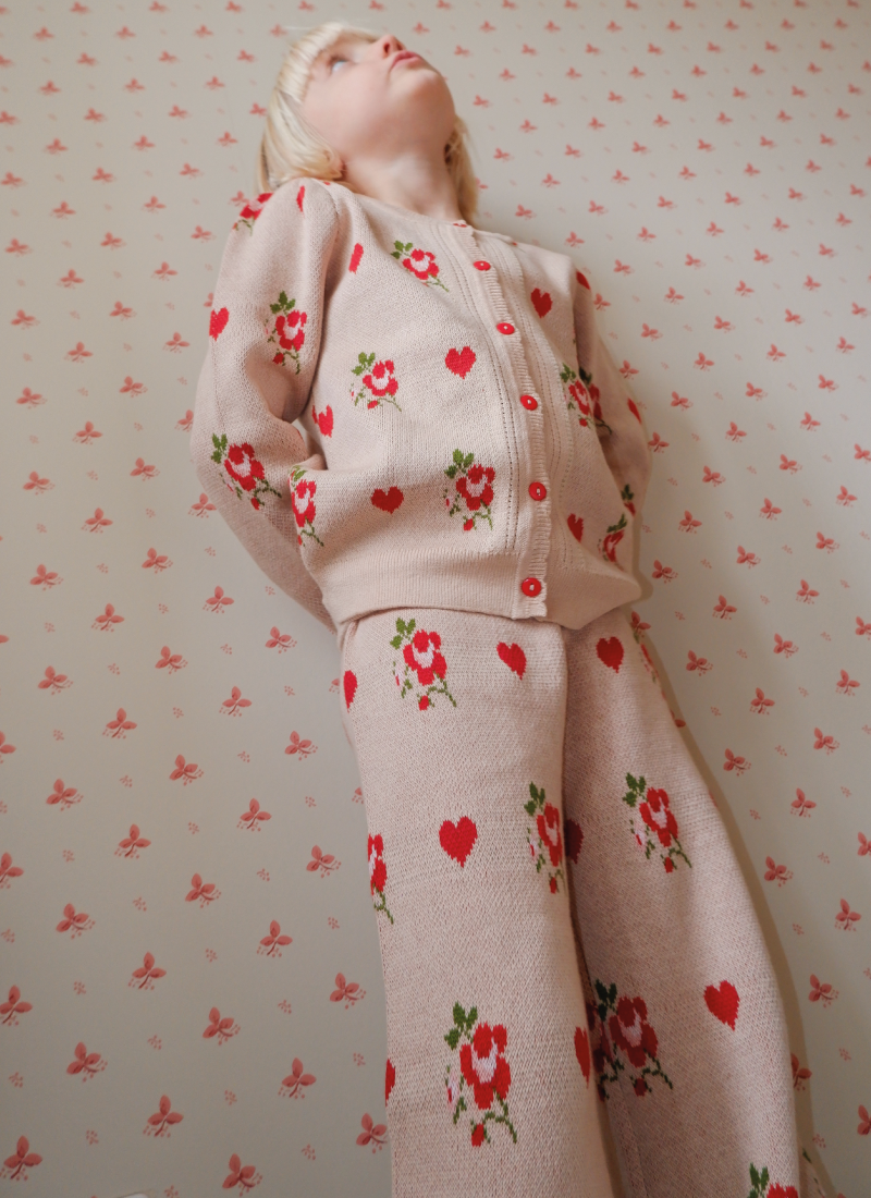 The Amelia trousers in warm ecru, with delicate red roses and hearts embroidered across, are crafted from a stretchy knit cotton. With a wide-legged palazzo style, their gentle texture and classic fit make them a cosy favourite for the fall/winter season. An easy piece to elevate everyday outfits with a subtle pop of colour.