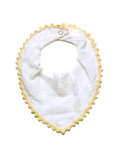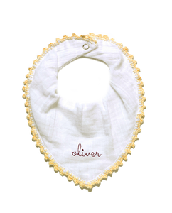 Little muslin baby dribble bibs that fasten at the neck with a popper and feature fun, colourful, crochet trims. Crafted from the finest cotton this bib can be personalised with a name or initials..