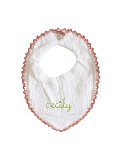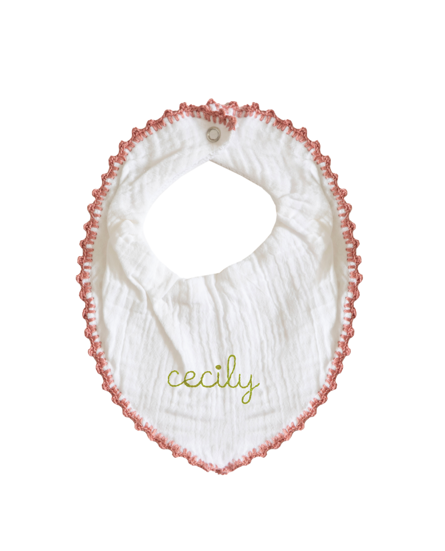 Little muslin baby dribble bibs that fasten at the neck with a popper and feature fun, colourful, crochet trims. Crafted from the finest cotton this bib can be personalised with a name or initials..